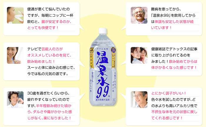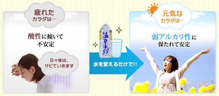 特に、温泉水99は、世界最高品質のアルカリイオン水ですから、さびた体を元に戻し、元気と活力を取り戻す事が出来ます。