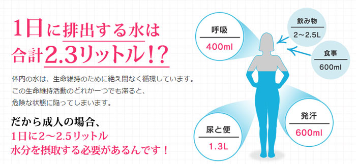 また、健康を維持するためには、1日に約2.5Lの水を飲む必要があります。
